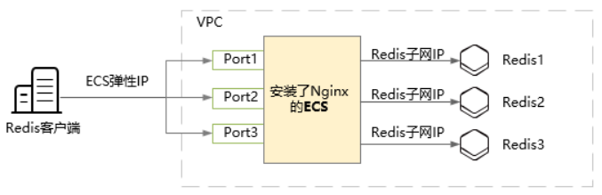 下图中安装了Nginx代理工具的ECS就是一台跳板机,它与DCS Redis实例在相同VPC,可通过子网IP访问Redis实例;为ECS绑定弹性IP后,公网可以访问ECS;Nginx支持监听多个端口,并将请求内容转发到不同的后端Redis实例。