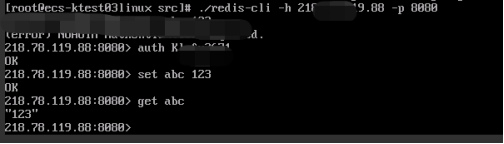 - 在公网环境中打开Redis命令行界面,输入如下命令,登录与查询都正常,大功告成。
