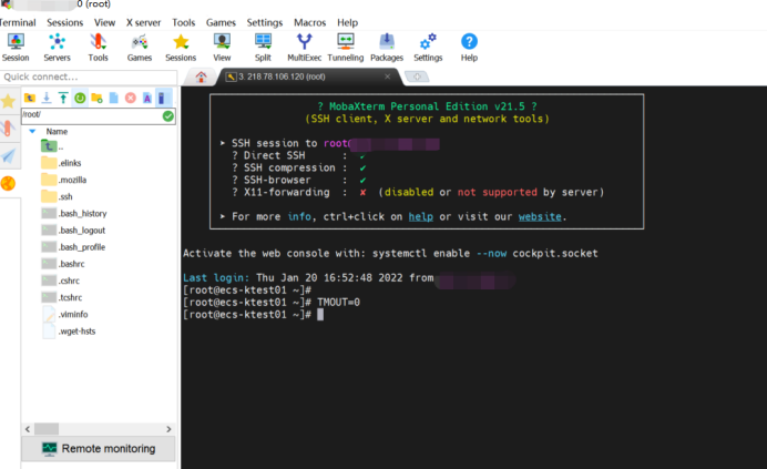 2.SSH连接配置好后,输入登录用户和密码,连接上ECS。登录后输入TMOUT=0,避免连接超时自动关闭。