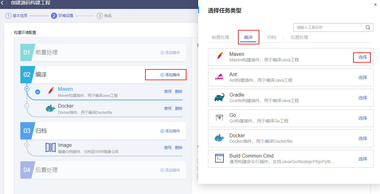 - 单击目标任务类型的“选择”,添加任务类型。并在“构建环境配置”界面右侧设置任务参数。