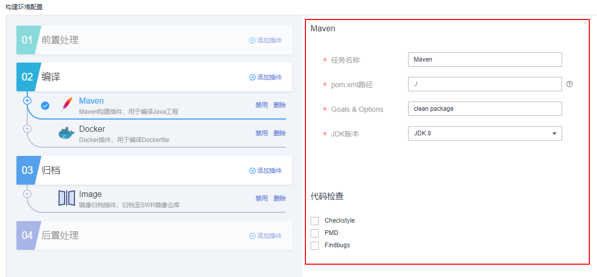 | 查看详情/构建历史 | 单击目标构建工程名称,在“构建记录”下查看构建历史。 单击构建记录名称,可以查看本次构建记录日志。 单击“代码检查”,可以查看代码检查概况及代码检查详细信息。目前支持的代码检查插件有:checkstyle、findbugs、pmd。 |