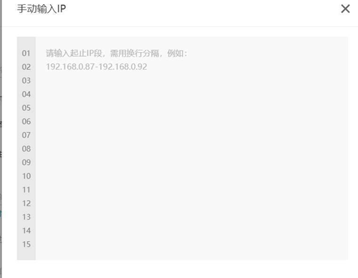 用户手动设置被扫描的网段。在该情况下,则至少需要设置一个网段,也可以添加多个不同的网段。如果是多个网段,需要注意容错处理(比如网段之间的重复、IP 地址是否合法等)。
