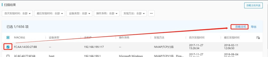 忽略主机列表指的是在发现主机列表中手动忽略掉的主机。勾选要忽略的主机,点击“忽略主机”按钮即可添加到忽略主机列表中。