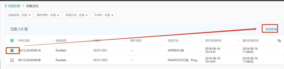 加入到忽略主机列表后的主机将不再出现在发现主机列表中,已忽略的主机,可以在忽略主机列表界面取消忽略。