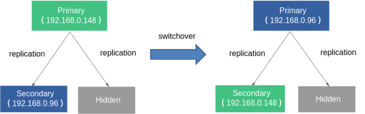 副本集的主节点不是固定的,当出现副本集配置改变、主节点宕机、人为主备切换等状况,会导致主备节点切换,此时副本集可能会选举出新主节点,原来的主节点则降为备节点。如下图所示: