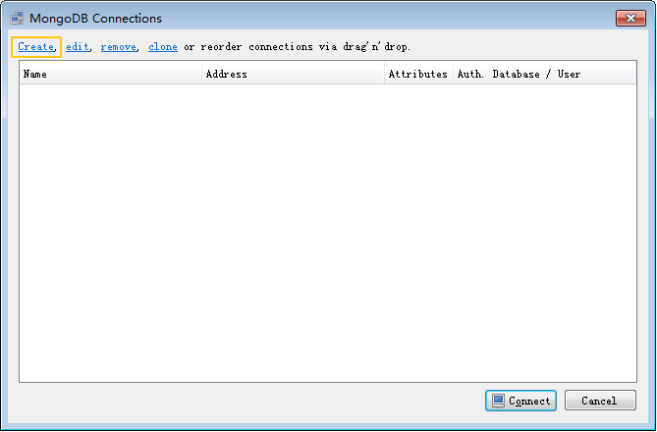 步骤 1打开Robo 3T工具,在连接信息页面,单击“Create”。