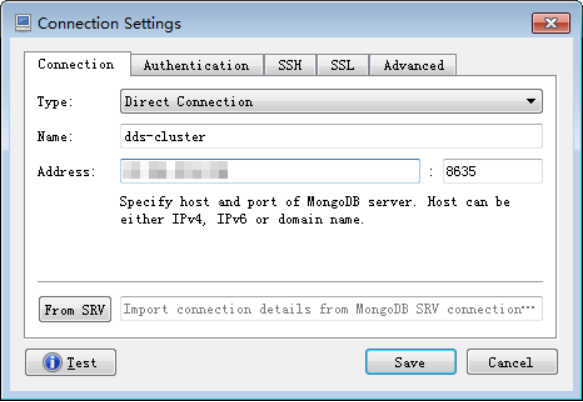 3.在“Connection”页签,“Name”填写自定义的新建连接的名称,“Address”填写集群实例绑定的弹性IP和实例的数据库端口。