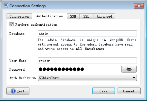 4.在“Authentication”页签,“Database”填写admin,“User Name”填写rwuser,“Password”填写您创建集群实例时设置的管理员密码。
