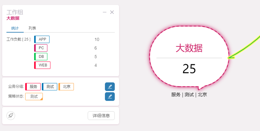 每个工作组有1-3个标签,分为位置标签、应用标签、环境标签,可以通过这三个标签来标识一个工作组,例如:“北京|电商|生产”、“天翼云|web|测试”等。