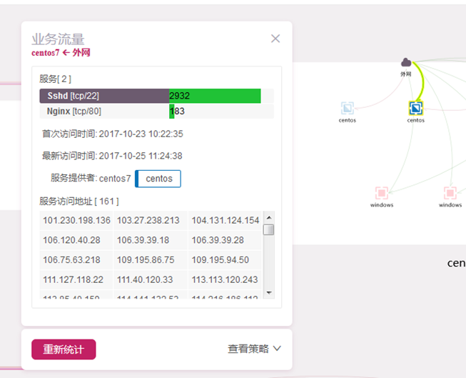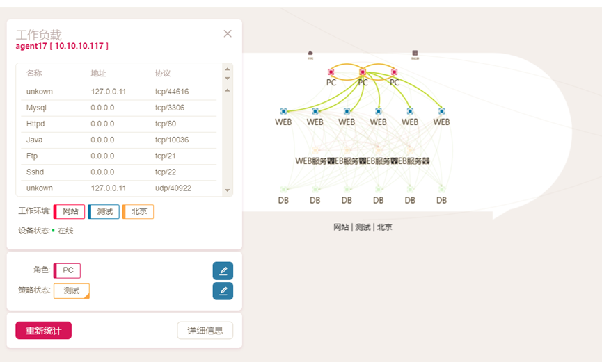 在工作负载基本信息框中可快速修改该工作负载角色及策略状态。重新统计按钮可清空所有针对此工作负载的访问连接记录。