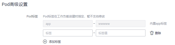 − Pod标签:内置app标签在工作负载创建时指定,主要用于设置亲和性与反亲和性调度,暂不支持修改。您可以单击下方的“添加标签”增加标签。