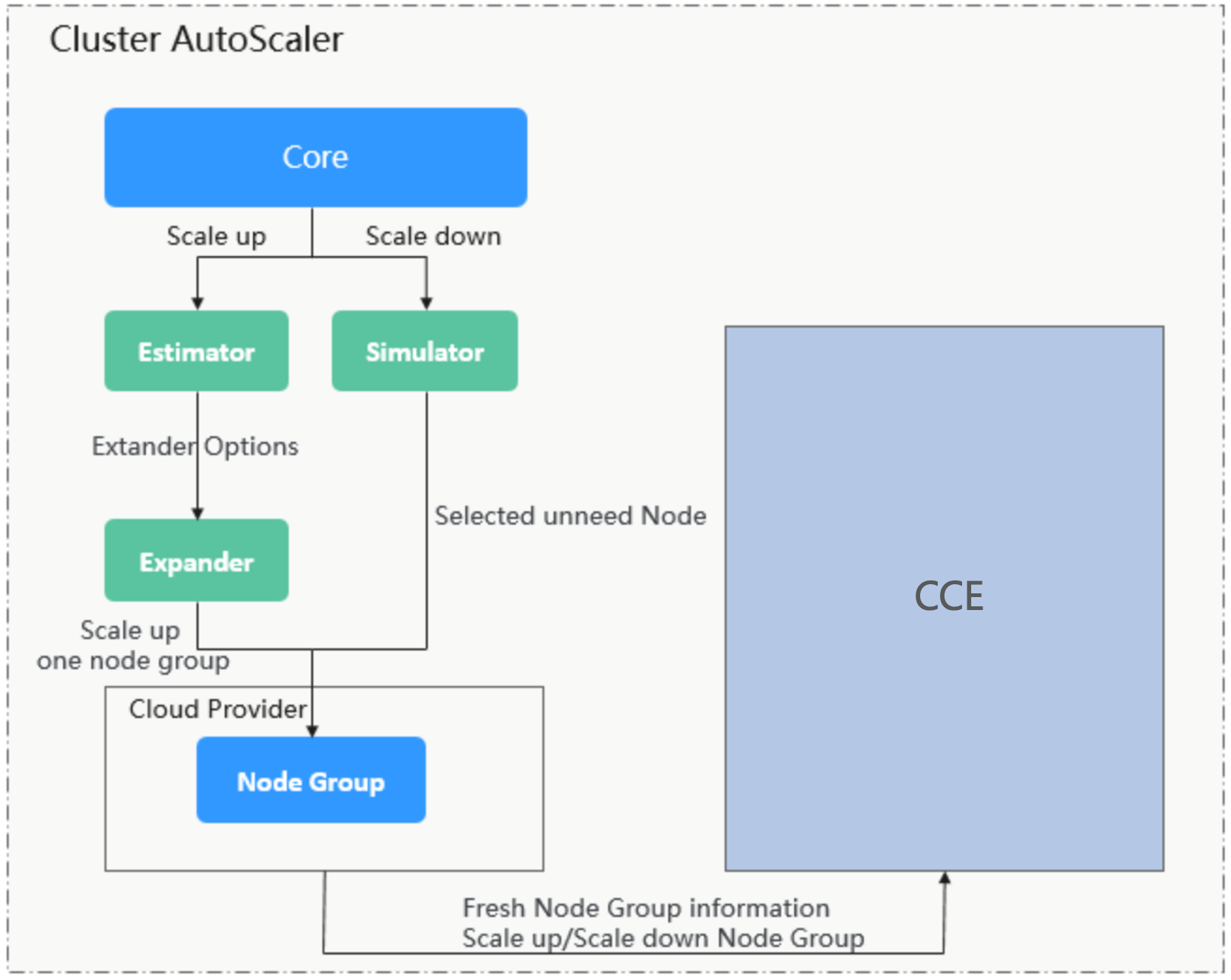 Cluster AutoScaler架构如下图所示,主要由以下几个核心模块组成: