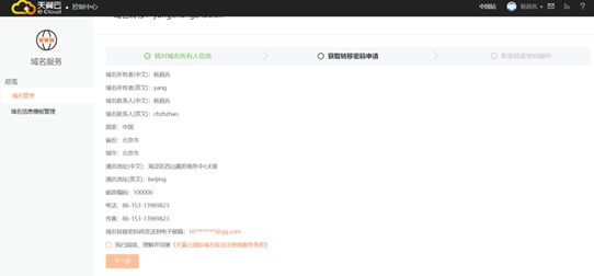 (3)在核对域名所有人信息界面,点击“下一步”;