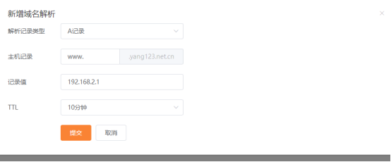 4、在新增解析界面,选择解析记录类型以及对应的相关内容,点击“提交”。即可完成域名的解析。
