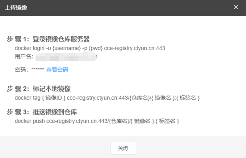 1)获取登陆指令及用户名密码:点击【上传镜像】后,从提示页面中可获取镜像登录指令及用户名密码,用户名可直接获取,密码可需要点击查看密码获取;