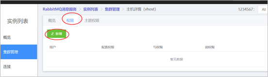 6.创建成功后给用户配置vhost的权限,选择目标虚拟主机,然后进入主机详情,点击权限tab页,点击新增权限。