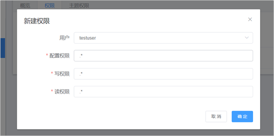 Tips:权限配置规则为正则表达式。例如 .* 表示所有权限。
