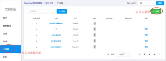 当创建Vhost时,会创建5个默认的Exchange,如需要额外创建Exchange,可进入实例列表的交换器选项卡进行新建。