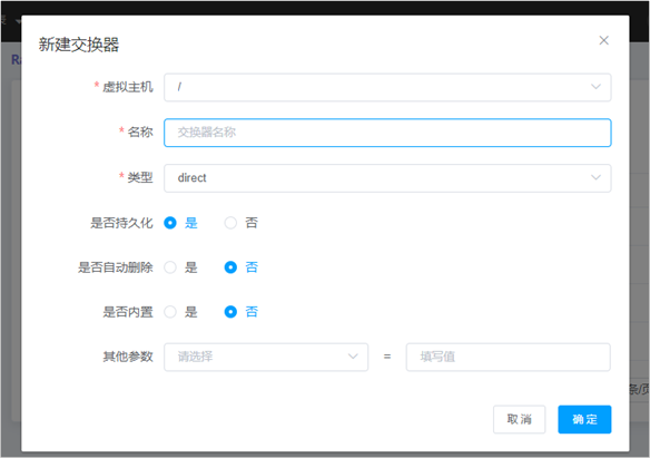 | 名称 | 交换器名称。以amq.开头的为保留字段,因此不能使用。例如:。 |