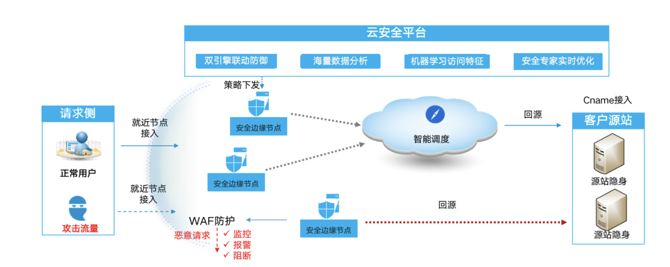 - 如果是正常业务请求,边缘节点会通过加速网络,进行缓存、动态选路等相关处置,最终将请求转发到客户源站,其中对于请求客户端来讲源站服务器是隐身的。