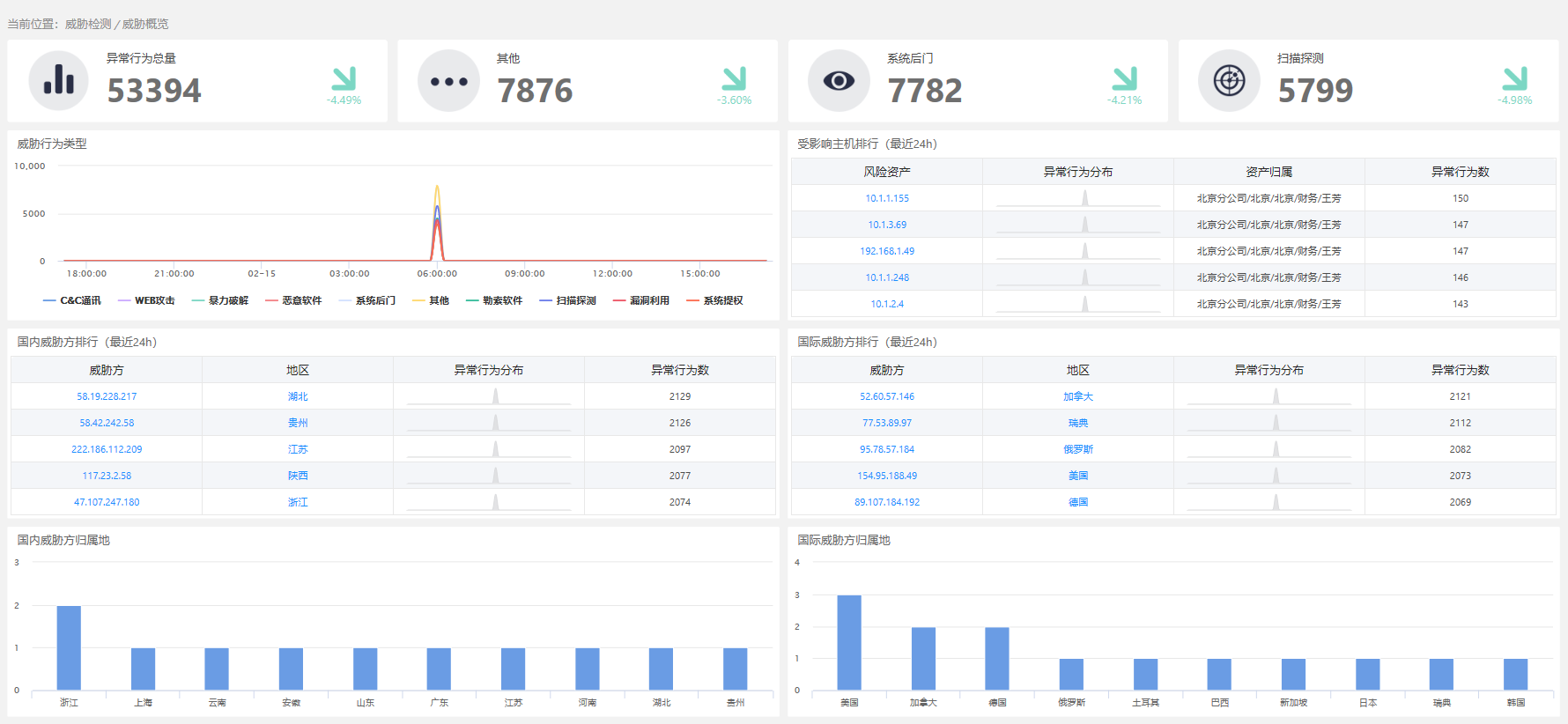 - 威胁方归属地:统计异常行为数最多的威胁方所在地,国内、国际分别统计TOP10。
