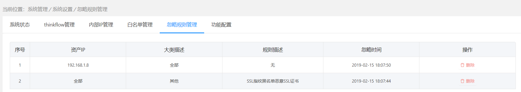 忽略的规则,通过“系统管理 > 系统设置 > 忽略规则管理”页面管理,将已经忽略的规则删除后,规则将继续生效。