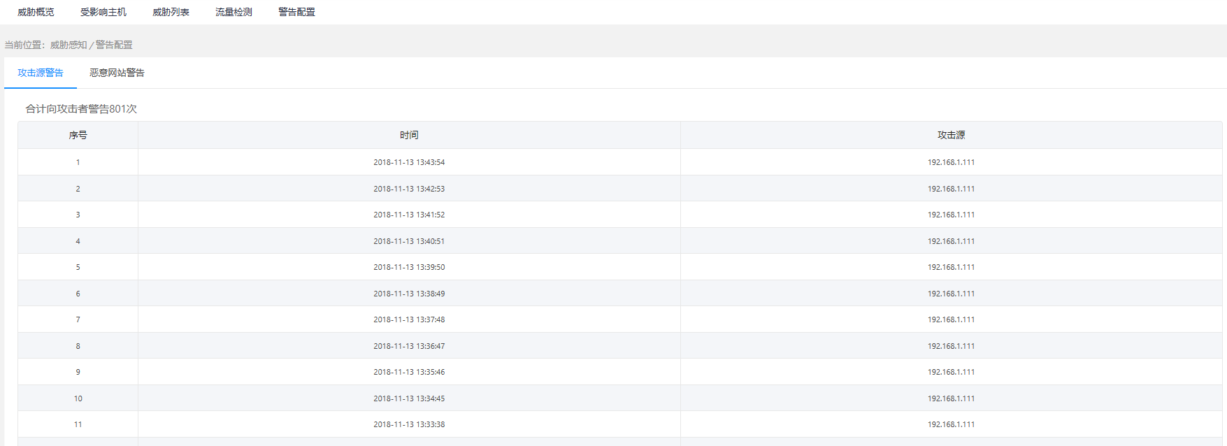 “威胁检测 > 警告配置”页面的攻击源警告,用于对攻击源警告。当系统检测到远端IP地址存在恶意入侵或者探测行为时,可以对相应的IP进行告警,对其推送告警界面,以做警示,并记录告警事件时间和攻击源IP地址。