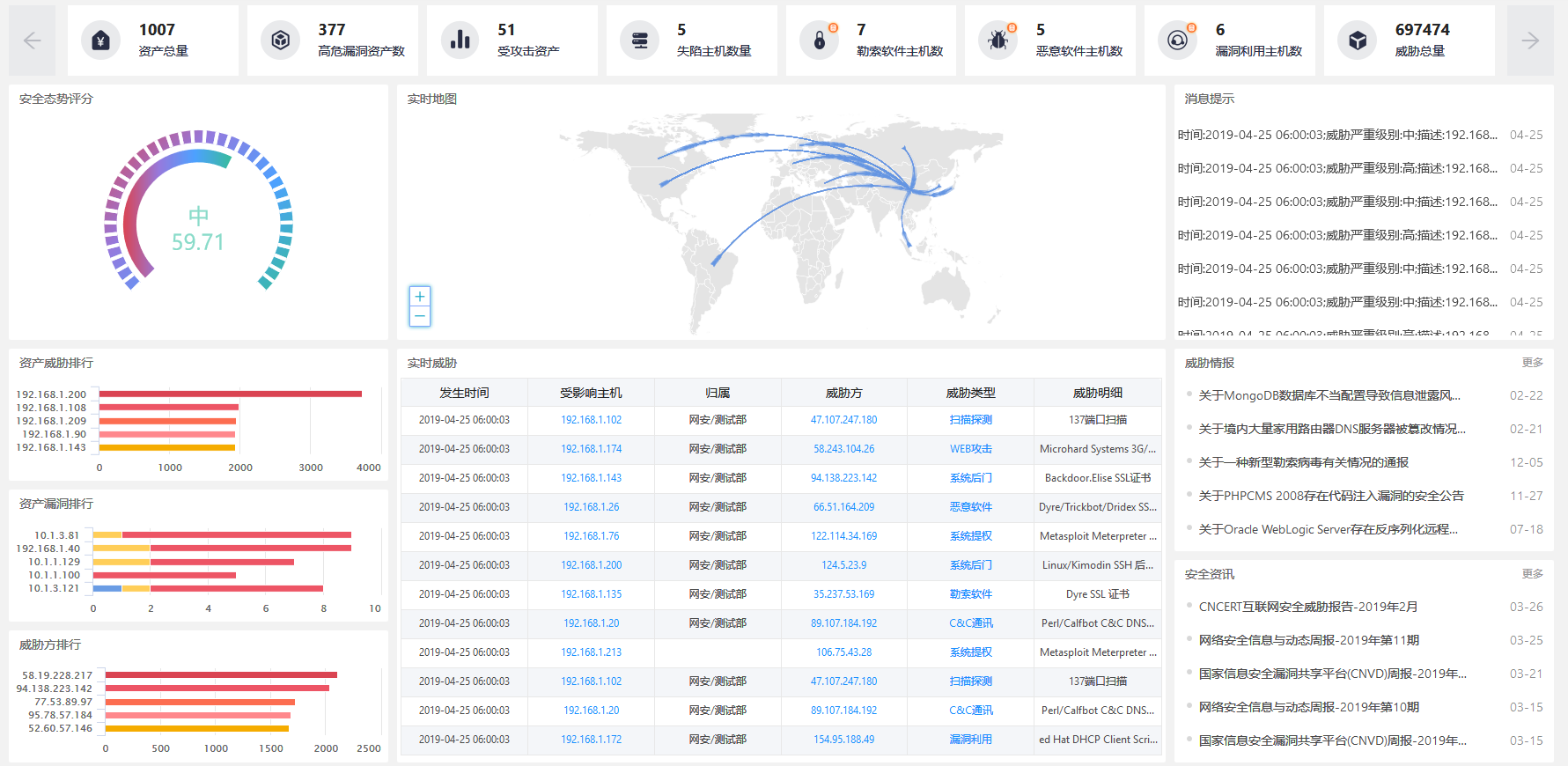 - 控制台首行数字贴:统计资产总量、高危漏洞资产、受攻击资产、失陷主机、勒索软件主机、恶意软件主机、漏洞利用主机、威胁总量。