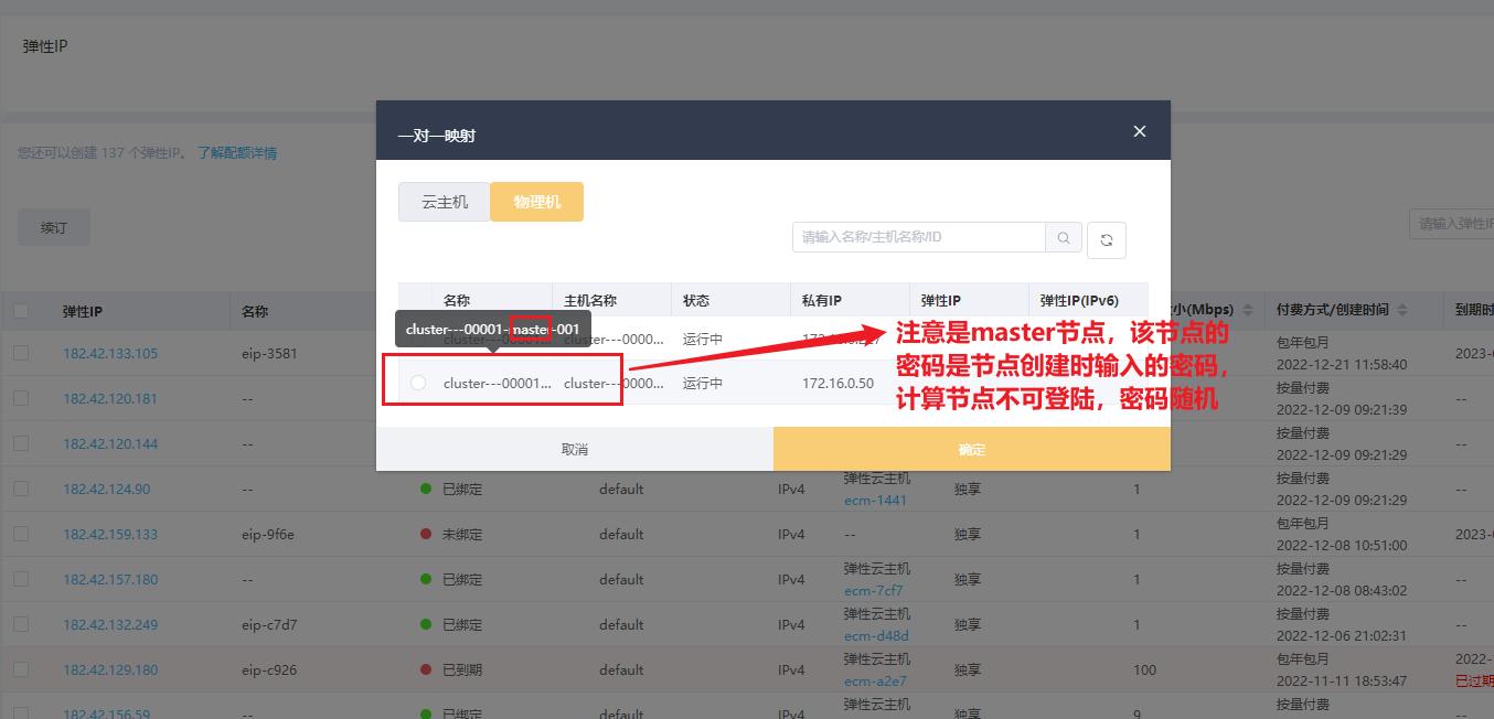 - 待集群创建完毕后,点击立即创建弹性IP,给管控节点绑定公网IP,供远程连接使用