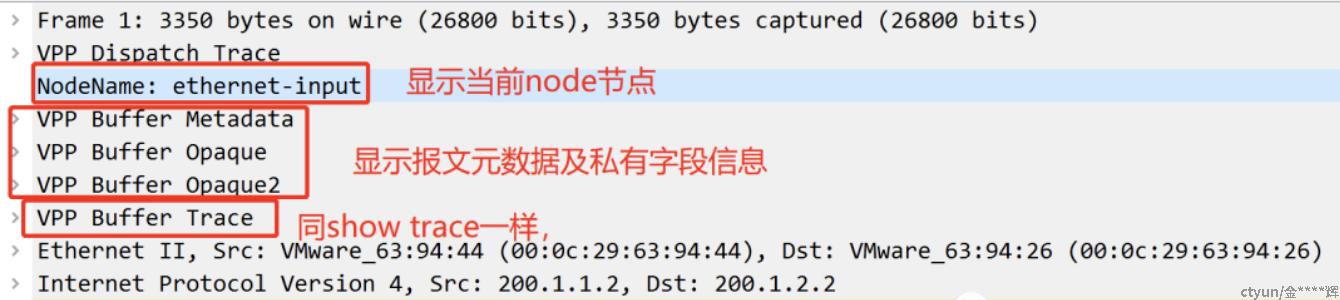 一种是pcap dispatch trace:用来抓取单个数据包转发node图,可以显示vlib_buff_t结构体数据及trace node图数据,并且支持支持vpp程序异常时存储pacp报文。