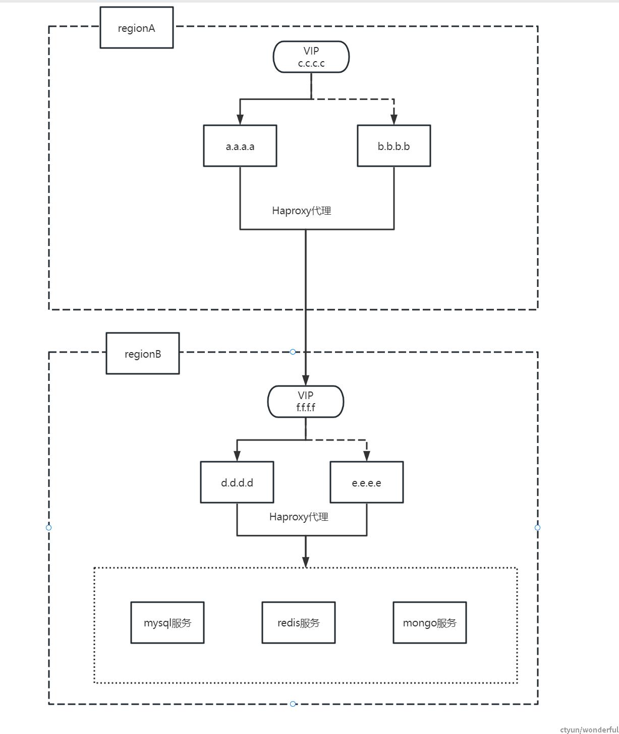 regionA机器:统一通过c.c.c.c访问mysql、redis和mongo服务。