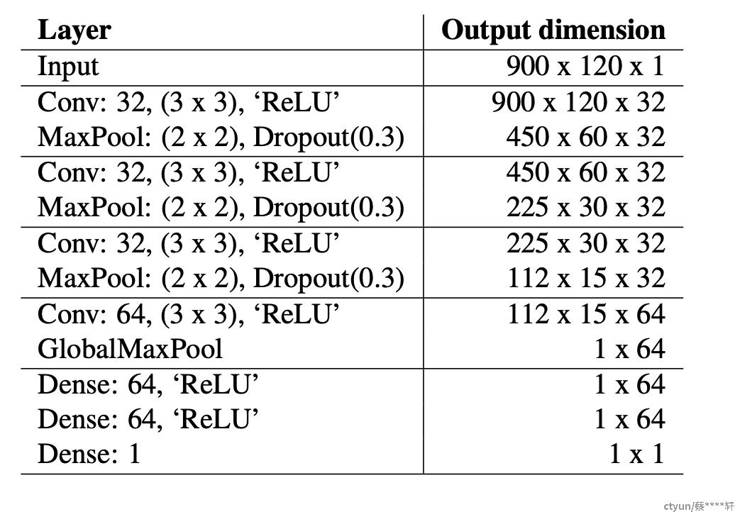 模型的输入是Spectrogram,120个Mel波段在长度为9秒的剪辑上计算,在16kHz采样,帧大小为20毫秒,跳跃长度为10毫秒,输入尺寸为900 x 120。该模型的batch大小为32,使用Adam优化器和MSE损失函数。Encoder和Decoder均由6个具有PReLU激活函数的Conv2d块组成,旨在从输入特征中提取高维特征,降低分辨率。将频谱特征作为输入。LSTM 层隐藏大小为512,T-F核大小为3 ,跨度为 1*2 ,每个 Conv2d 或 ConvTranspose2d 层后面跟着一个batchnorm层。在最后一个 ConvTranspose2d层之后嵌入线性层以映射输出特征的复数比率掩码(CRM)。最后,CRM与输入 stft 谱图相乘得到干净的 stft 谱图,所有的激活函数都是PReLU。