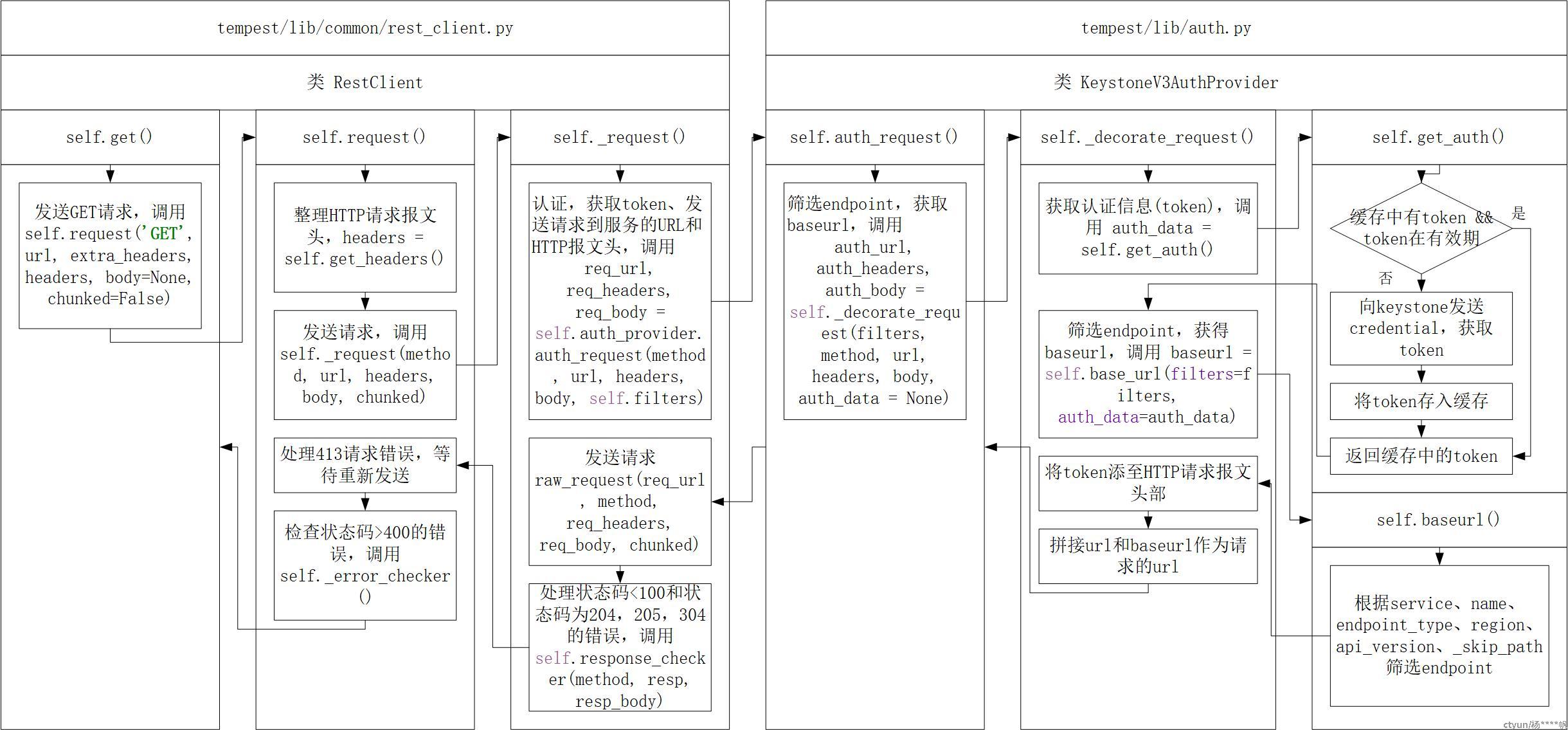 客户端中的self.auth_provider是KeystoneV3AuthProvider或KeystoneV2AuthProvider的实例,具体是哪个类的实例取决于环境中Keystone的版本和Tempest的配置。KeystoneV3AuthProvider提供了请求token和endpoint的功能,客户端的开发过程中就不用考虑认证部分了。