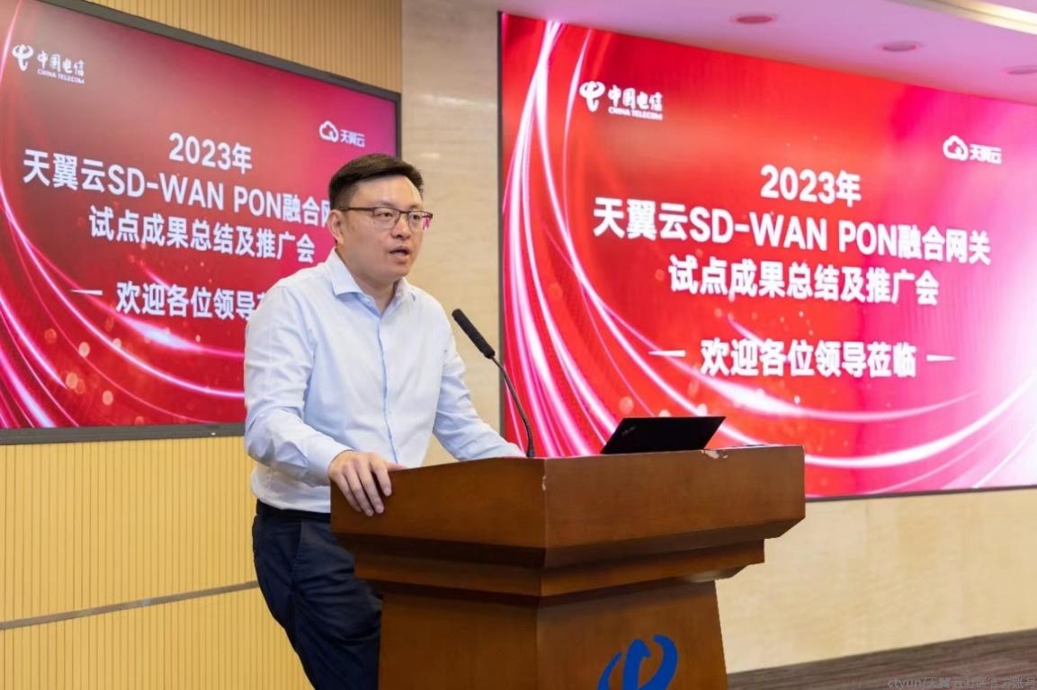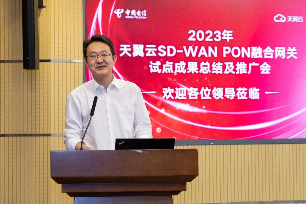 天翼云科技有限公司副总经理广小明对SD-WAN PON融合网关的开发历程和成果进行了详细介绍,从“云网融合”的新高度上,对SD-WAN PON进行了定位。他指出,天翼云SD-WAN PON融合网关(白盒)是中国电信加快构建以“云网融合”为核心特征的智能化综合性数字信息基础设施的新实践,是云网融合从协同阶段迈向融合阶段的重要一步。