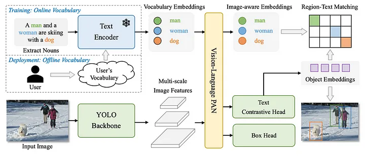 - 该篇工作的骨干网络采用了YOLO的现有结构,语言模型采用了CLIP模型。使用文本和图像特征中的特征通过区域到文本对比学习连接到 RepVL-PAN。YOLO检测将图像-文本数据集成到区域-文本对中。与传统的YOLO检测器相比,YOLO-World是一个开放的词汇检测器,它使用文本作为输入,而文本编码器首先将输入文本编码为嵌入。然后,图像编码器将输入图像编码为多层图像特征,RepVL-PAN对图像和文本特征进行多层跨模态融合。最后,YOLO-World 预测与输入文本中出现的类别或名词匹配的校准边界框和对象嵌入。