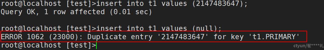 注:int类型为4字节,最大值就到2147483648,以下为MySQL自增主键用满的内容截图: