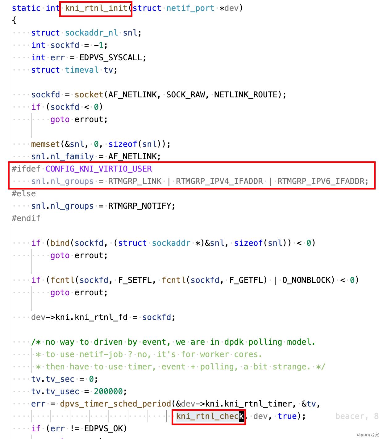 总体流程是:创建 AF_NETLINK/NETLINK_ROUTE 套接字 -> 配置要监听的组(nl_groups) -> bind 到本地 netlink 地址 -> 把套接字设置为非阻塞 -> 将文件描述符保存到 dev->kni.kni_rtnl_fd -> 用 dpvs_timer_sched_period 安排一个周期性定时器(200ms)去调用 kni_rtnl_check。