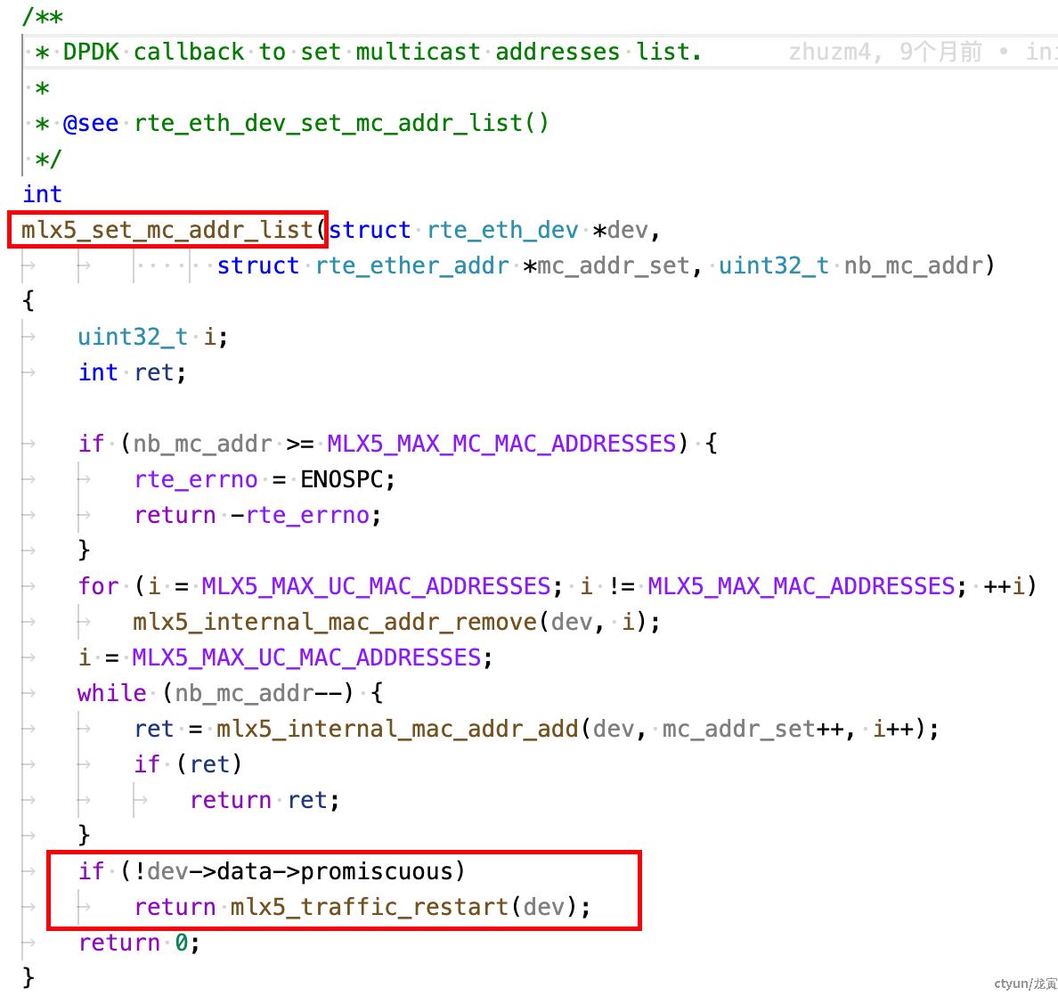 (3)关闭混杂的情况下,会触发该问题,因为最终会调用到 mlx5_traffic_restart 接口。而打开混杂的场景下,不会调用 mlx5_traffic_restart 接口,自然不会触发该问题,这是代码本身的逻辑。