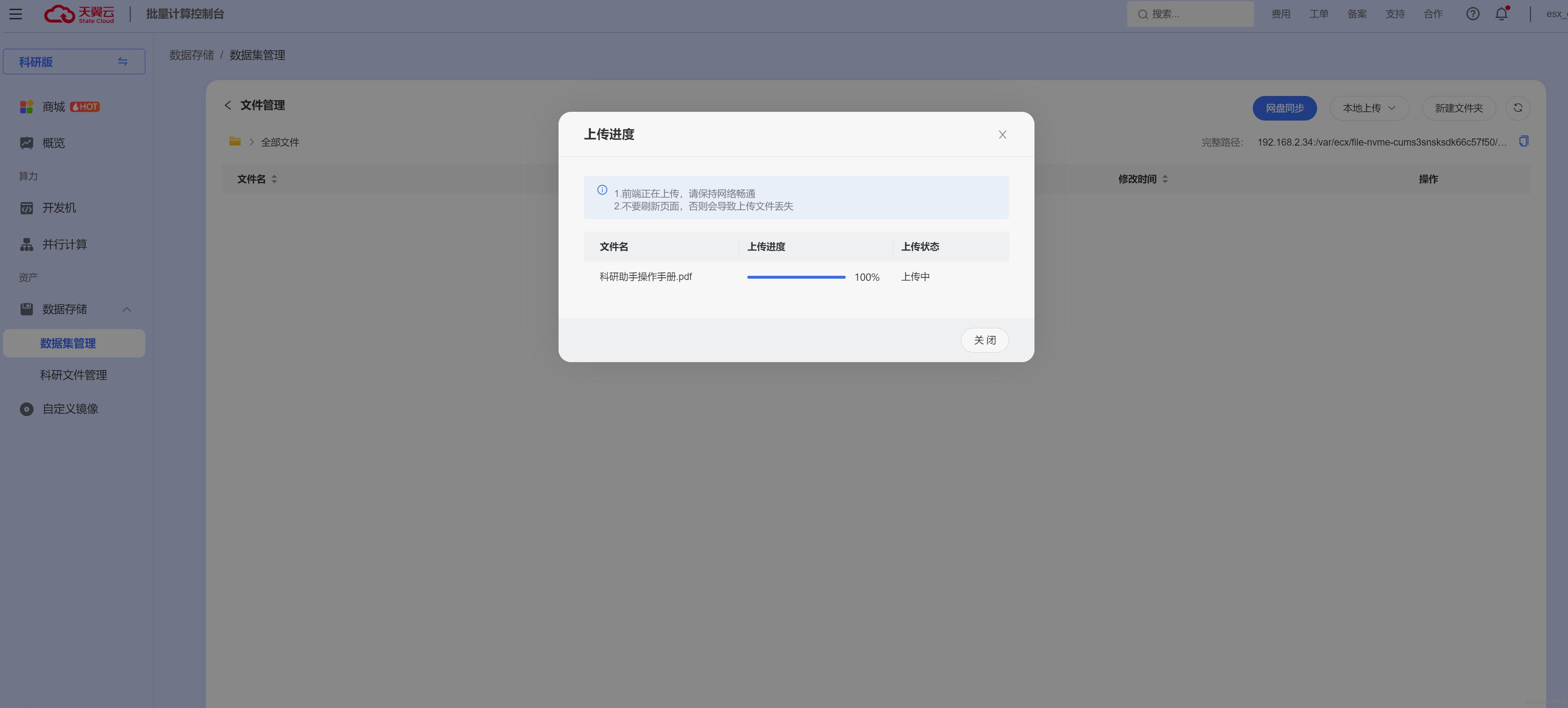 在搭建知识库过程中,如需要引用本地文档,请提前在科研助手中通过【数据存储】功能,将本地数据传至开发机上。此处以数据集管理为例,演示如何创建及挂载。