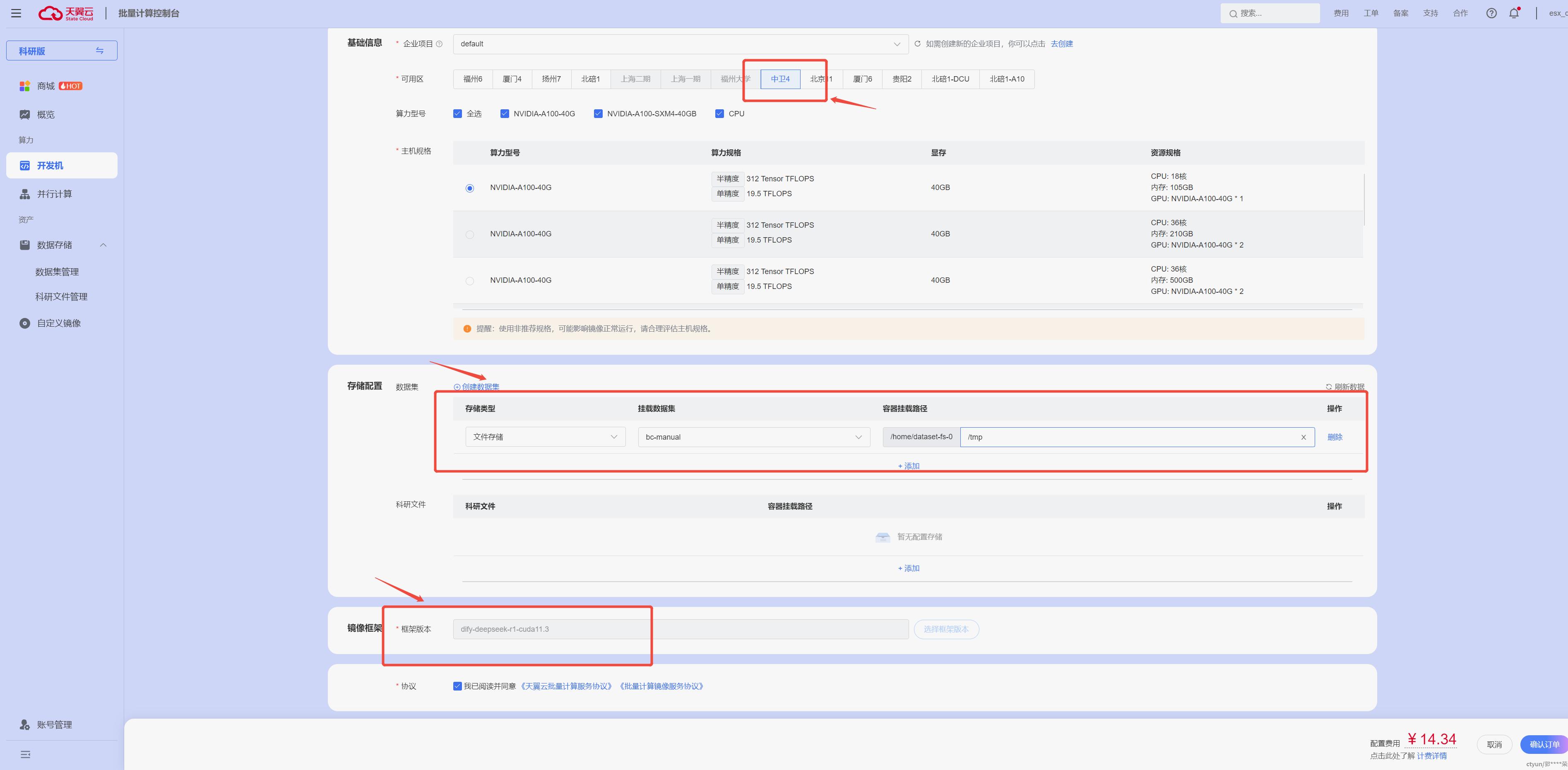 这里以可用区中卫4的NVIDIA-A100-40G为例,可以看到,【存储配置】中已经挂载了在中卫4创建的数据集bc-manual,【镜像框架】中框架版本已默认选好【社区镜像】的“dify-deepseek-r1-cuda11.3”,其余【计费模式】、【可用区】等可按照实际需要选择。