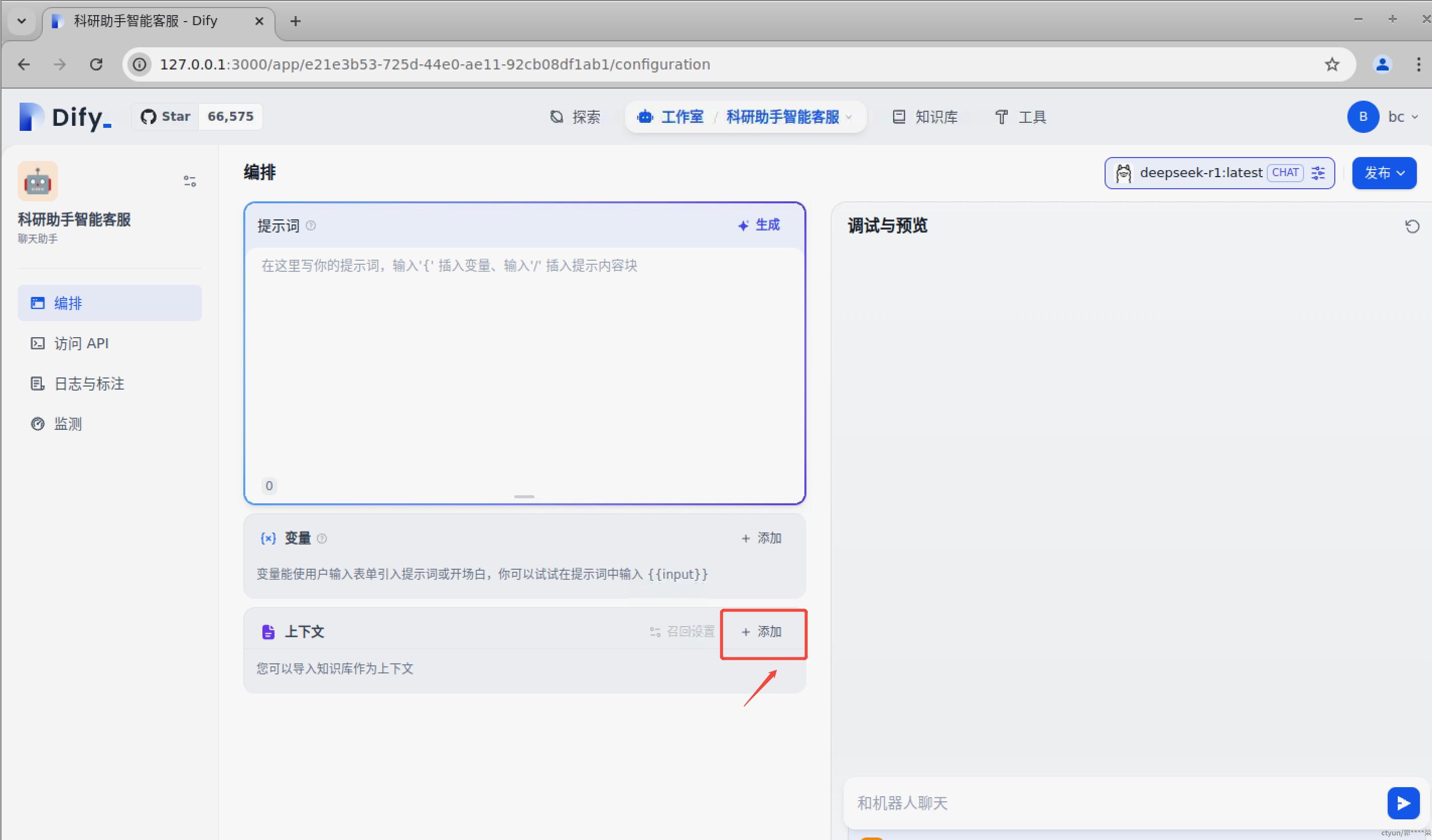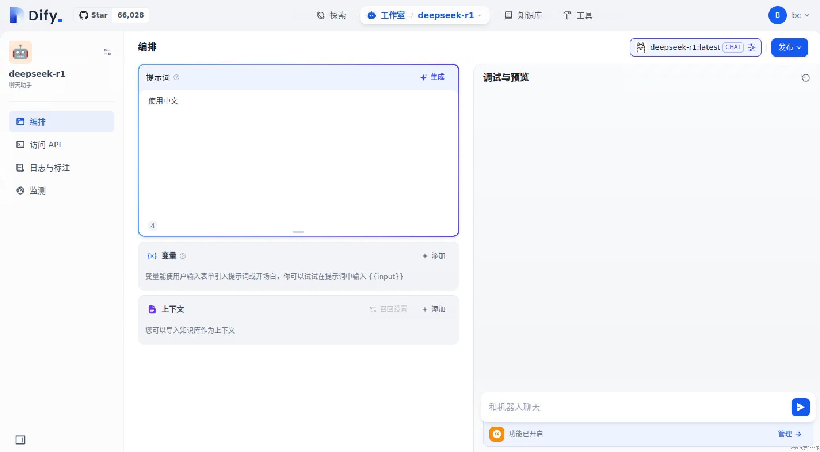 步骤2:进入到 deepseek-r1 聊天助手中,可以在页面中设置提示词、上下文、聊天等;