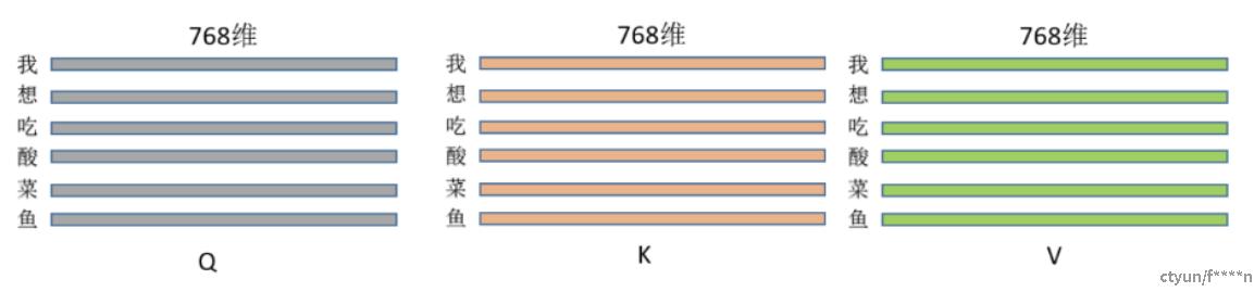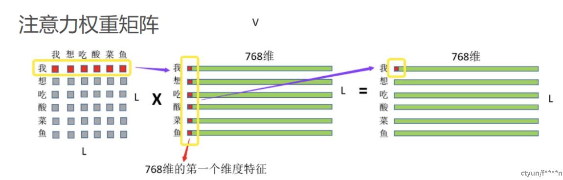 (2)然后再用“我”这个字对对“我想吃酸菜鱼”这句话里面每个字的注意力权重和V中“我想吃酸菜鱼”里面每个字的第二维特征进行相乘再求和,依次类推最终也就得到了(L,768)的结果矩阵,和输入保持一致。
