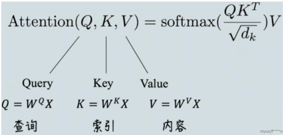 其中,X 表示输入的数据,Q , K , V 对应内容如图,其值都是通过X 和超参(先初始化,后通过训练优化)进行矩阵运算得来的。