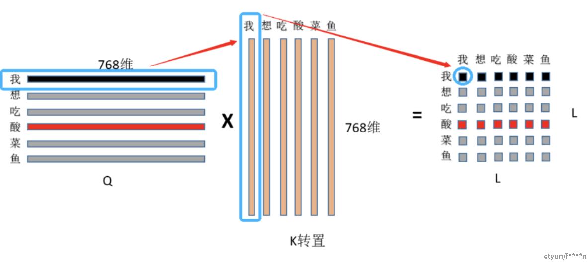 (1)首先用Q的第一行,即“我”字的768特征和K中“我”字的768为特征点乘求和,得到输出(0,0)位置的数值,这个数值就代表了“我想吃酸菜鱼”中“我”字对“我”字的注意力权重;
