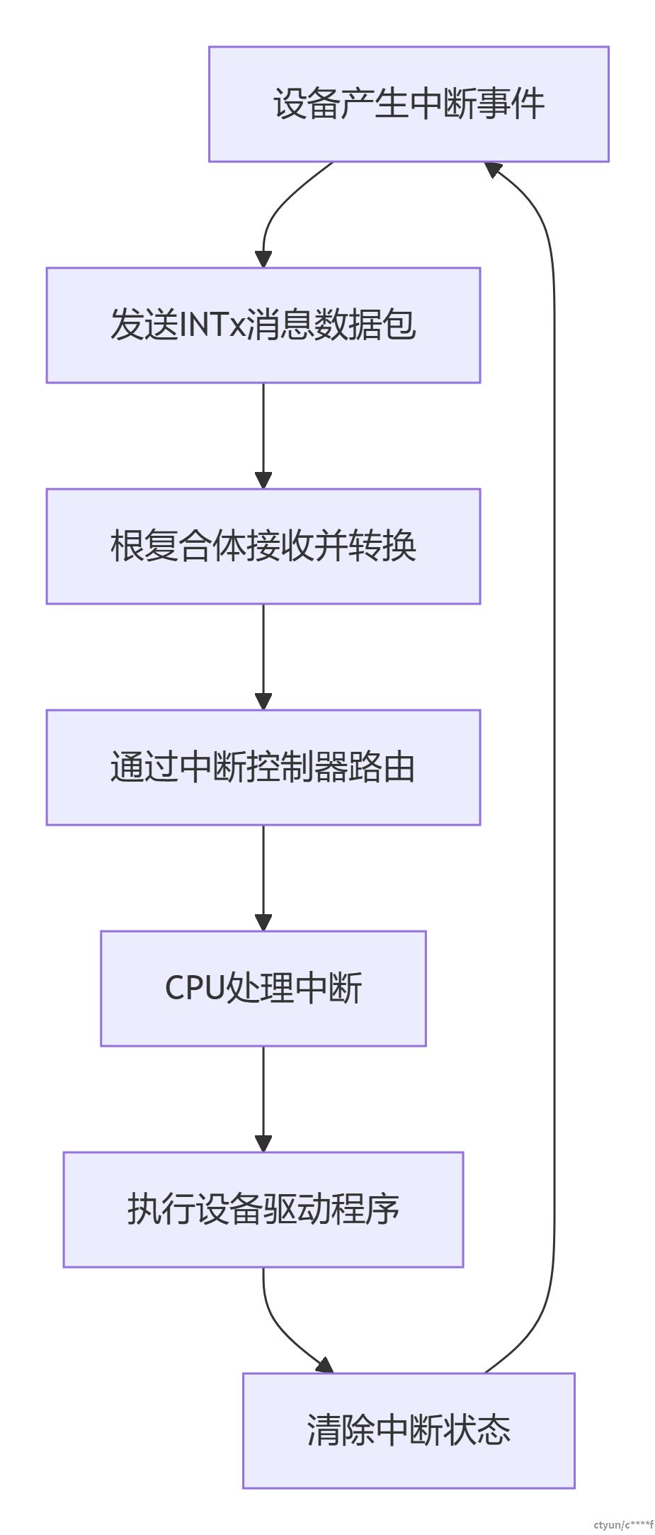 传统PCI/PCIe设备使用四根虚拟的INTx信号线(INTA、INTB、INTC、INTD)来请求中断。这些信号并非物理连线,而是在PCIe数据包中模拟实现的。