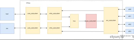 数据报文通过PCIe接口从两个方向进入FPGA:Host侧和SOC侧均通过上方pcie_subsystem接入。两个子系统分别完成PCIe协议的解包和DMA传输,将数据传递至对应virtio_subsystem。