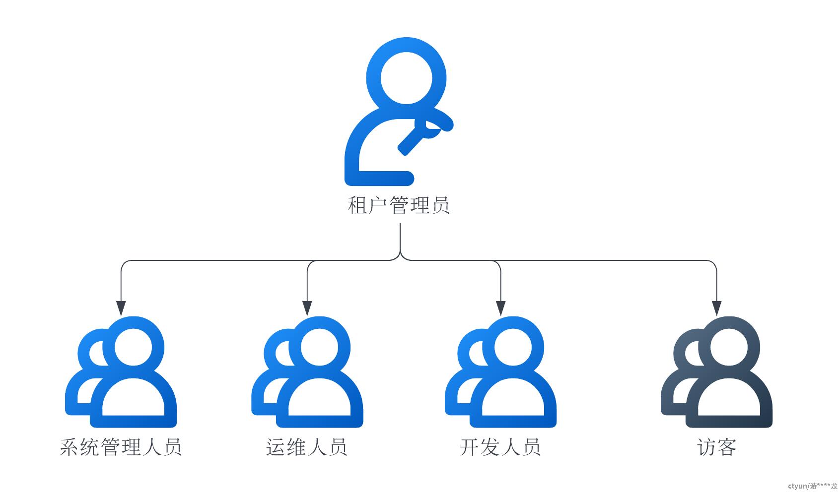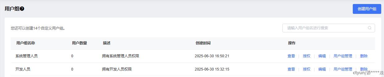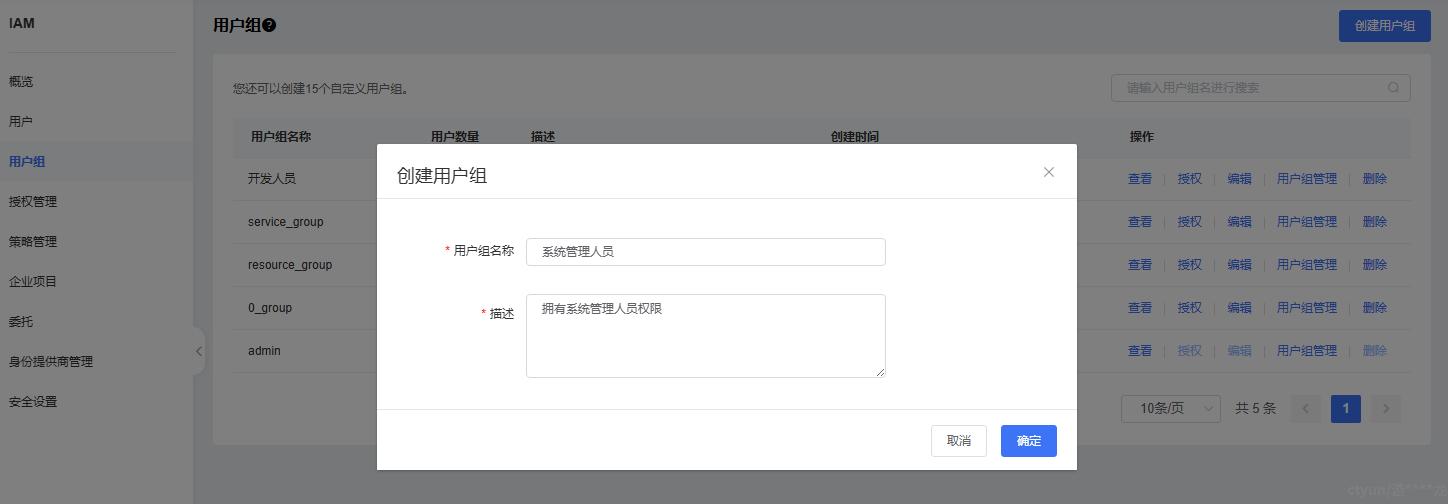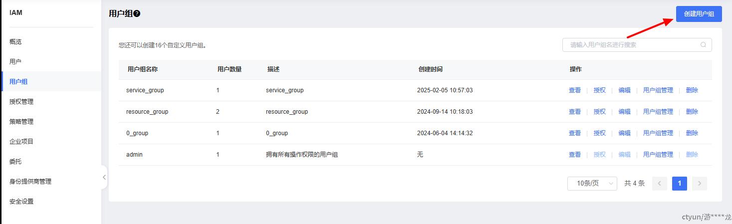 租户管理员拥有所有产品权限,负责给各个职能团队进行IAM授权,根据本例子的权限设计,首先创建四个用户组,分别是系统管理人员、运维人员、开发人员、访客人员,方便对员工分组管理。