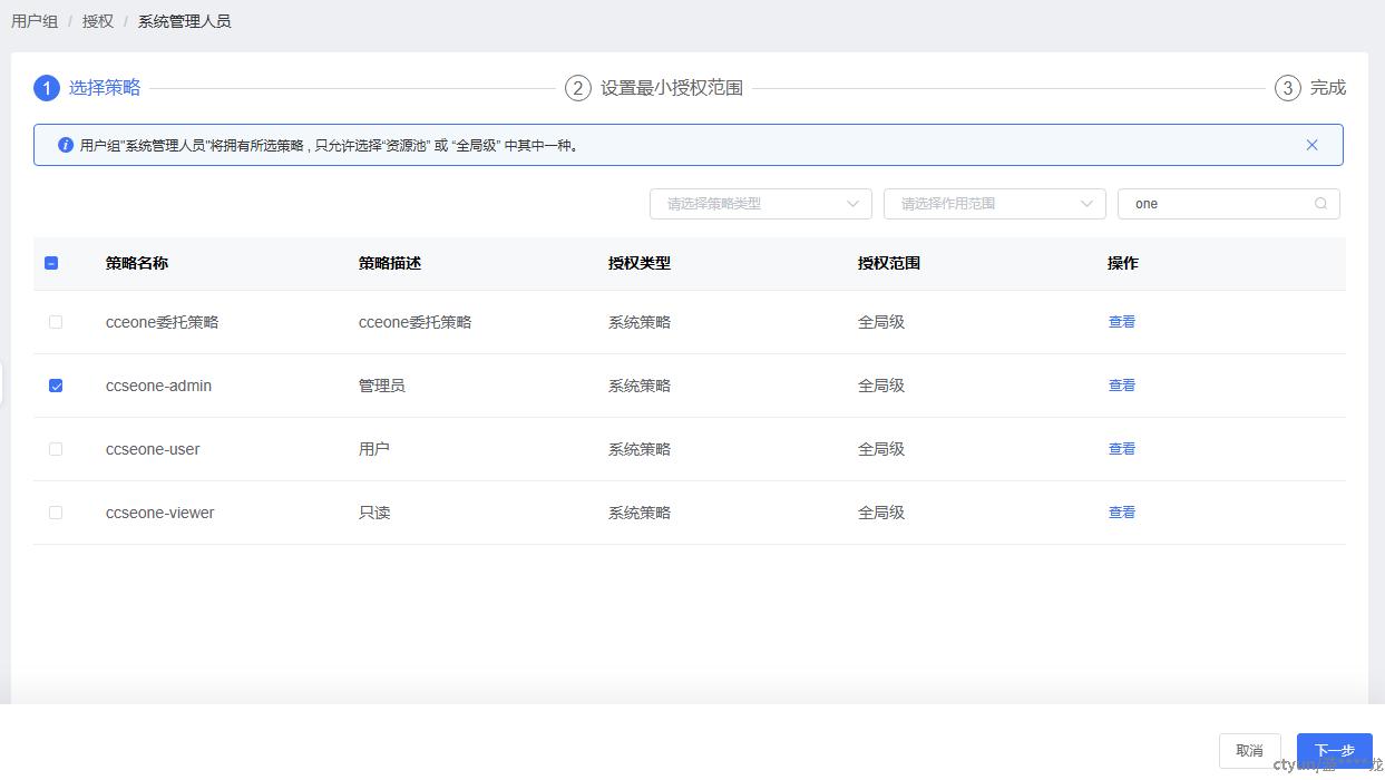 本例子将赋予「系统管理人员」用户组 ccseone-admin 权限。