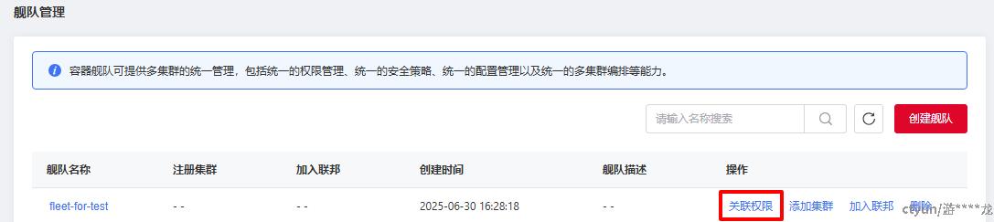 Kubernetes RBAC 权限策略需完成「关联权限」操作后生效,该操作可在注册集群、舰队或联邦的对应列表页面进行。