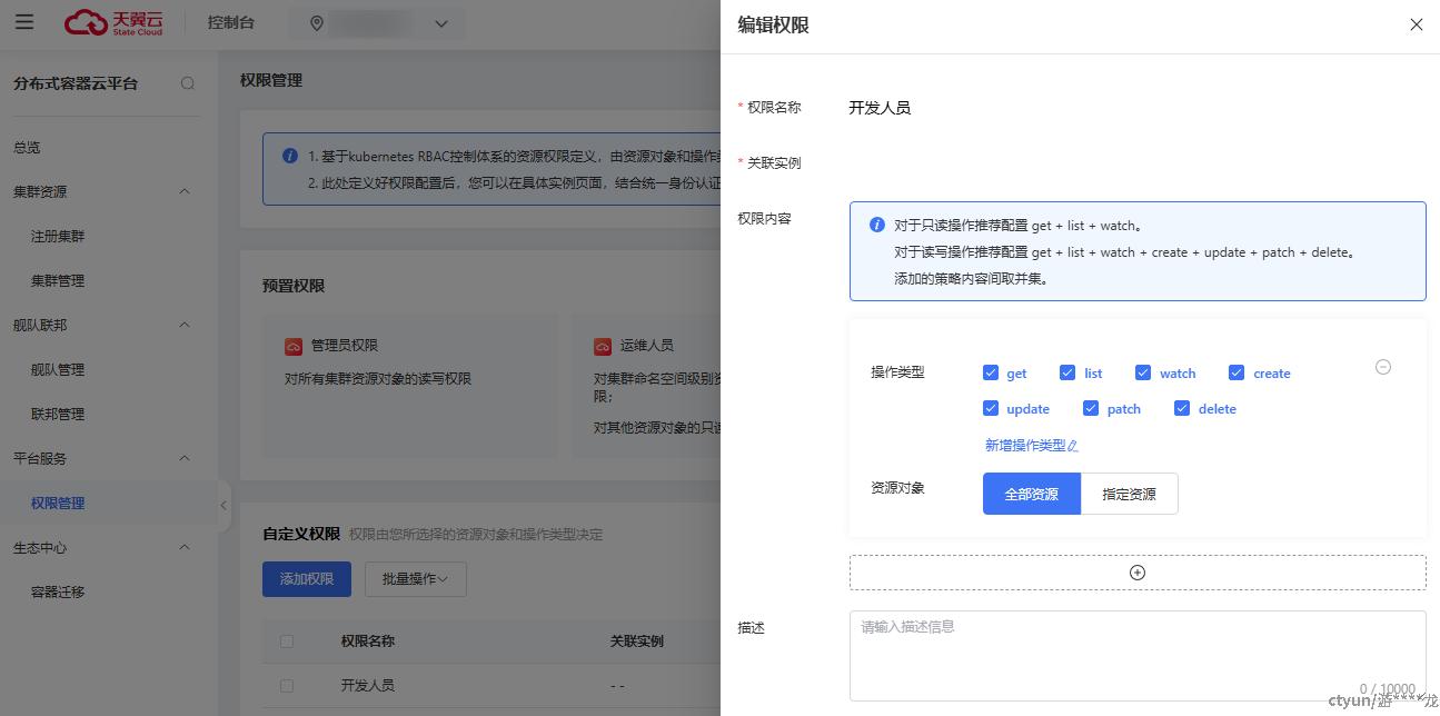 分布式容器云平台提供四种预置权限(管理员、运维人员、开发人员和受限人员),同时支持用户灵活创建自定义权限。创建自定义权限,可访问分布式容器云平台「平台服务」-> 「权限管理」页面,进行Kubernetes RBAC权限策略管理。